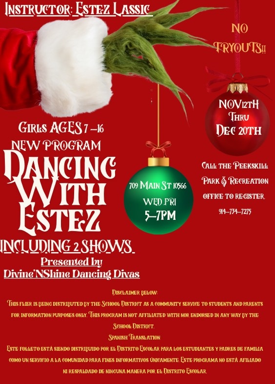 NOTE: To have your flyer posted on this website, it MUST contain the district disclaimer. Please submit all flyers for posting to nrecuppio@peekskillschools.org.